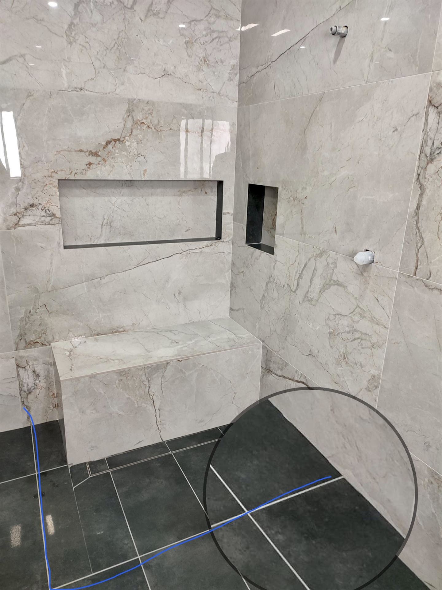 Drag the handle on each photo to wipe between the original bathroom and the finished install.