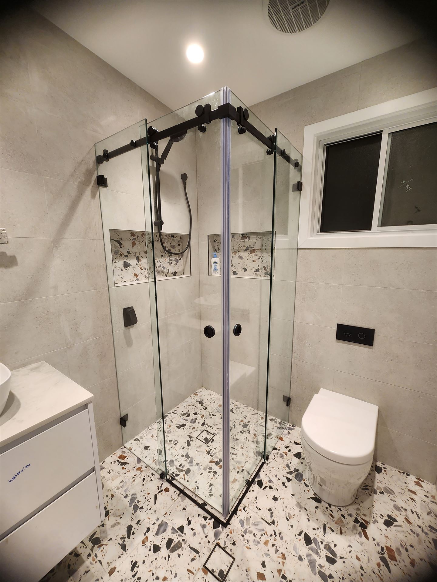 Drag the handle on each photo to wipe between the original bathroom and the finished install.